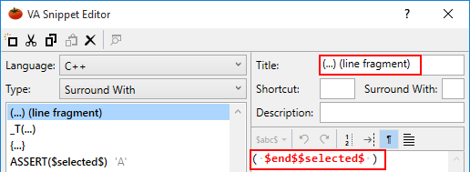 The Surround Selection feature of Visual Assist wraps full lines and lines fragments with parentheses and braces. When wrapping full-line selections, parentheses or braces are placed on separate lines—before and after the selection.